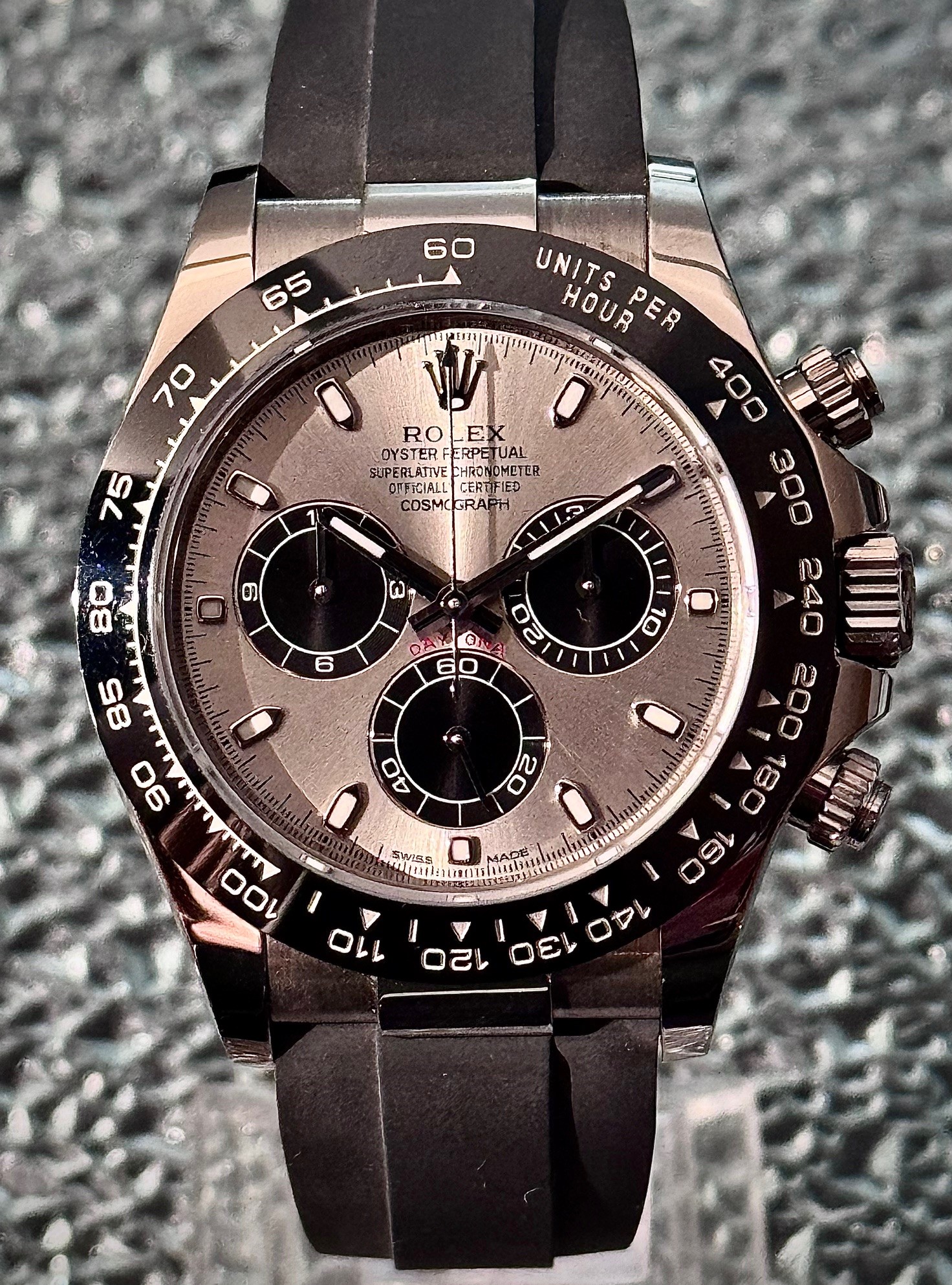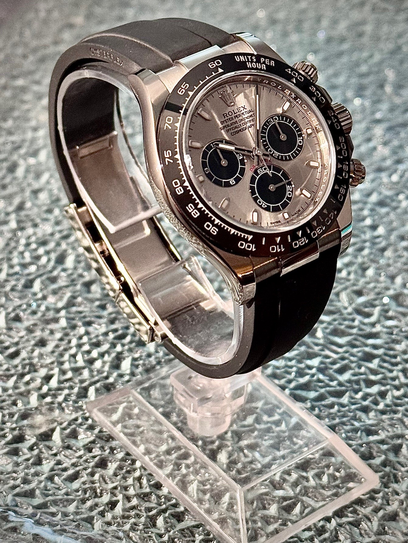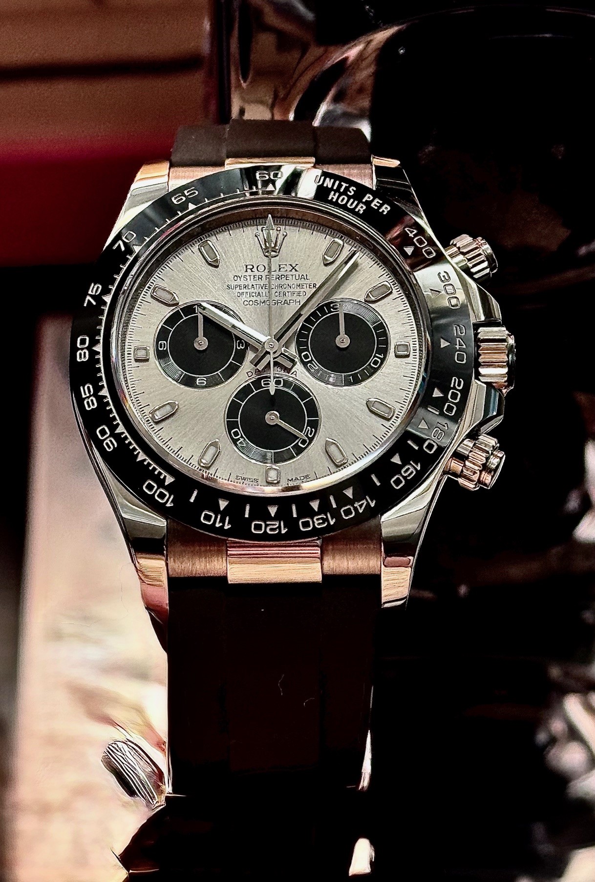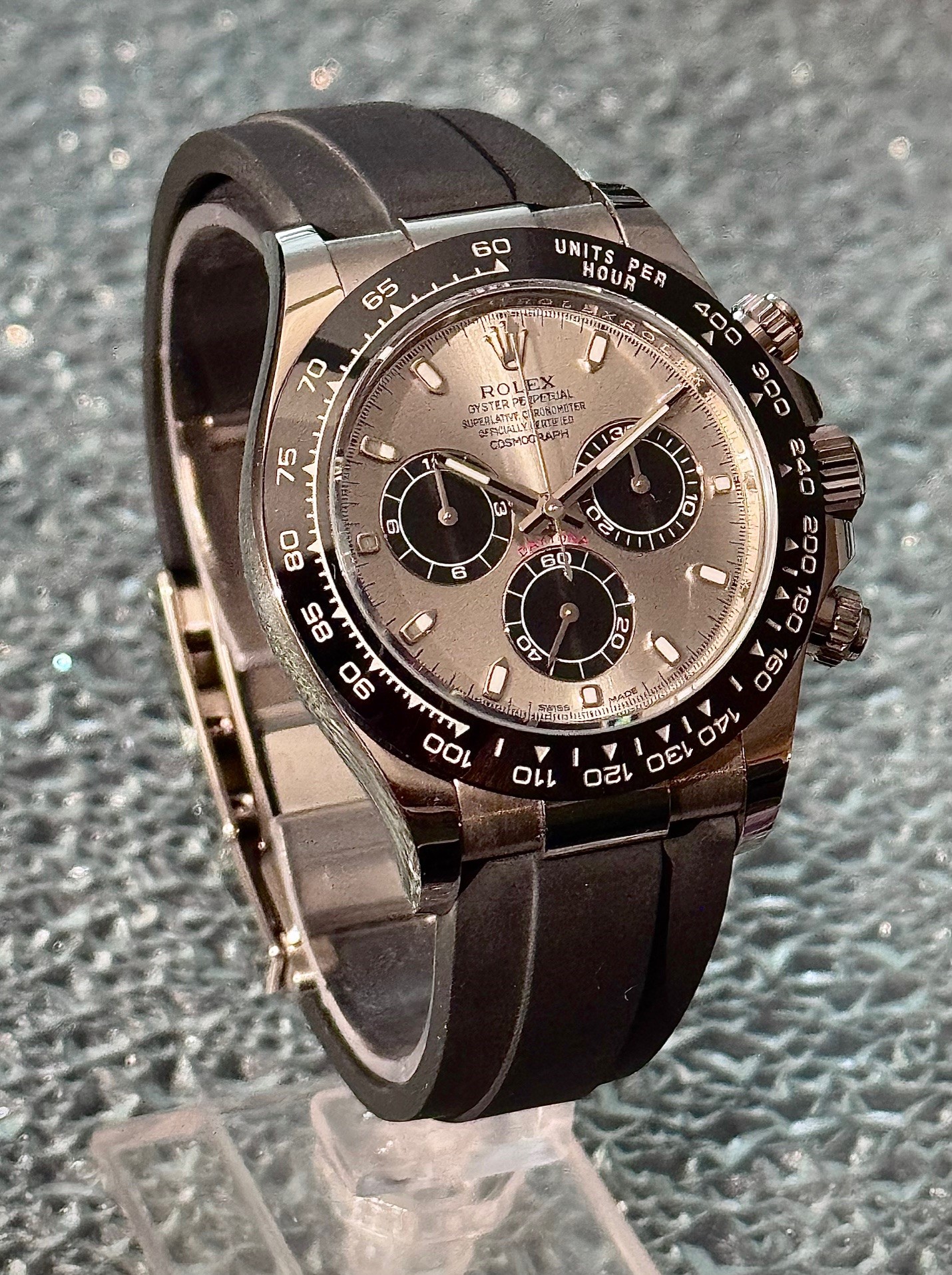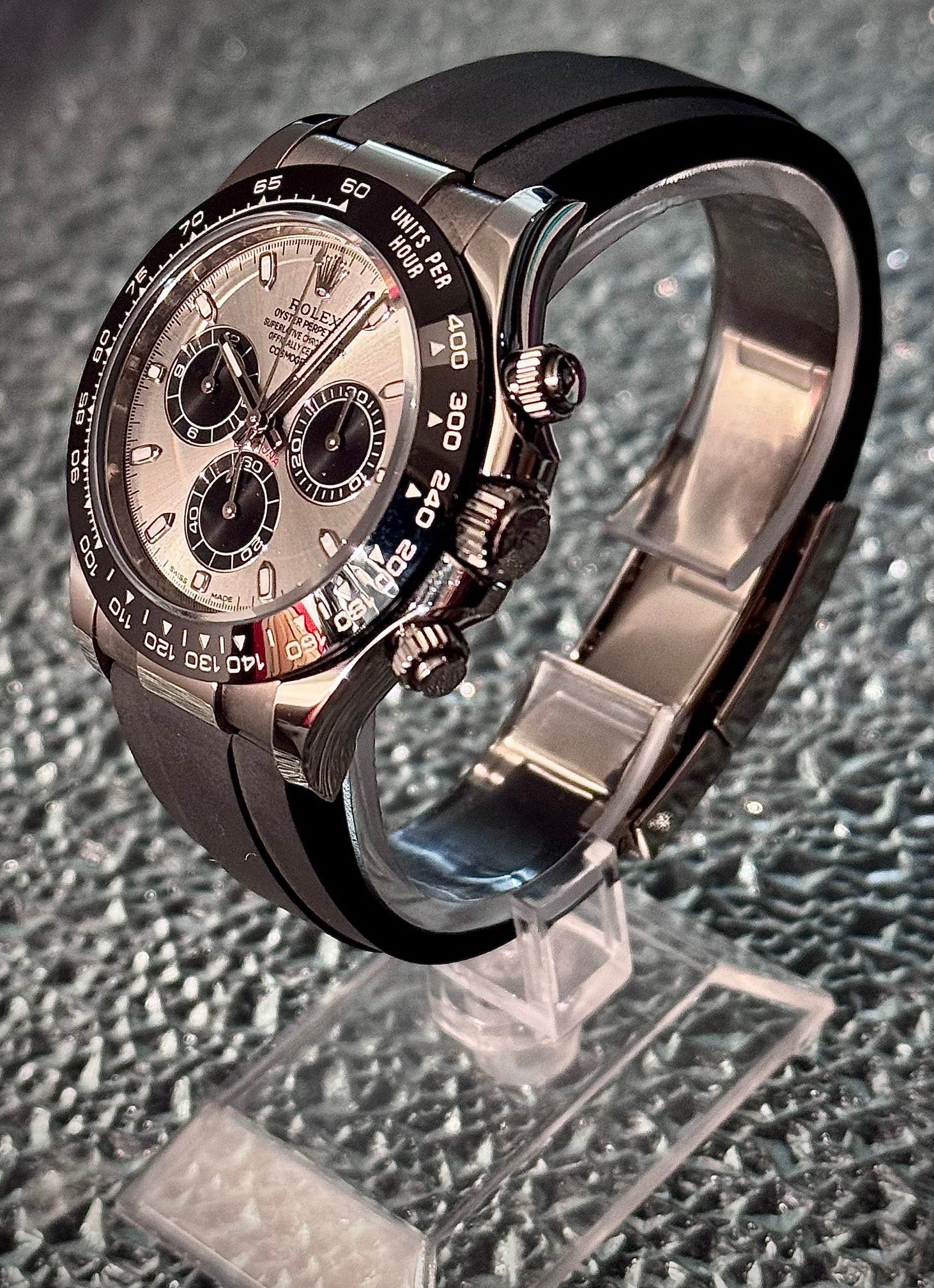Introduction de la référence 116519 (vers 2000). La 116519 est la version 40 mm en or blanc 18 carats de la Daytona automatique moderne, lancée au tournant des années 2000. Elle a été présentée aux côtés de plusieurs variantes de cadrans colorés « Beach » ou ornés de pierres exotiques et a marqué l’entrée de Rolex dans le monde des Daytona en métaux précieux après la période Zenith.