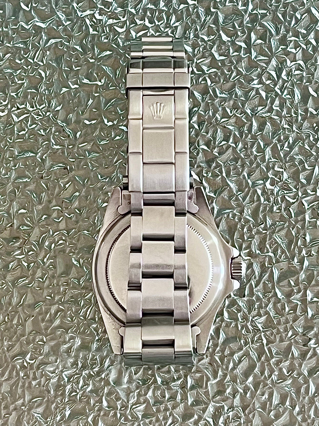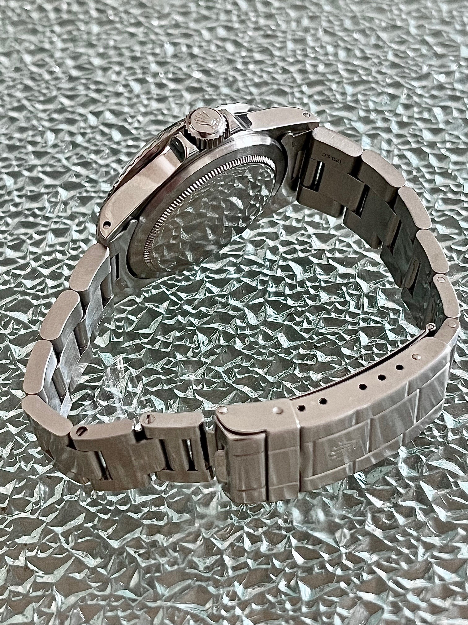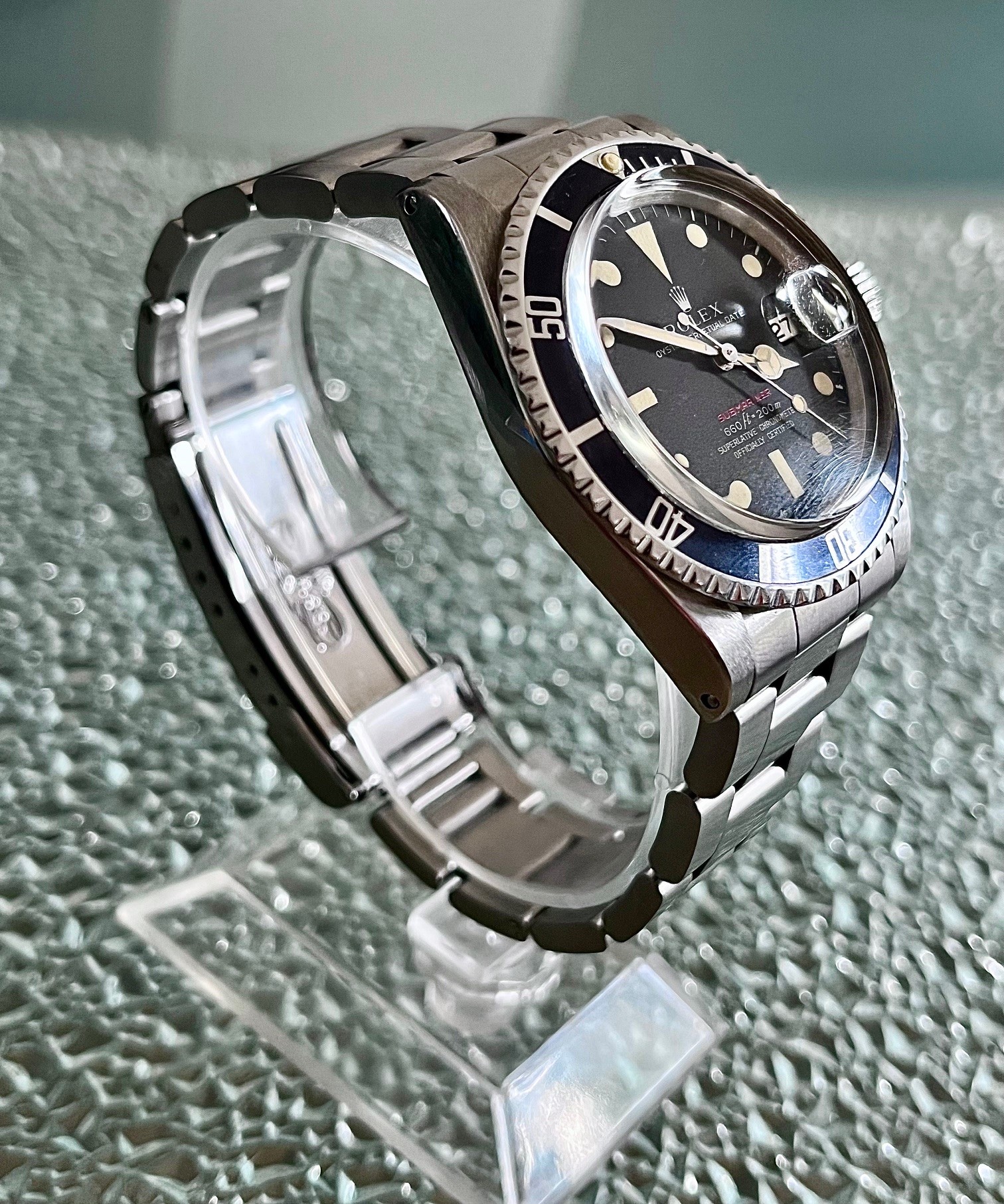 Le modèle proposé est de 1972. Un cadran noir mat à index peints tritium. Des aiguilles Mercedes et une date par guichet à 3H. Lunette alu patine bleuté. Verre plexi cheminée.Le bracelet est un Oyster 93150 end links 580. Un must have dans toute collection.