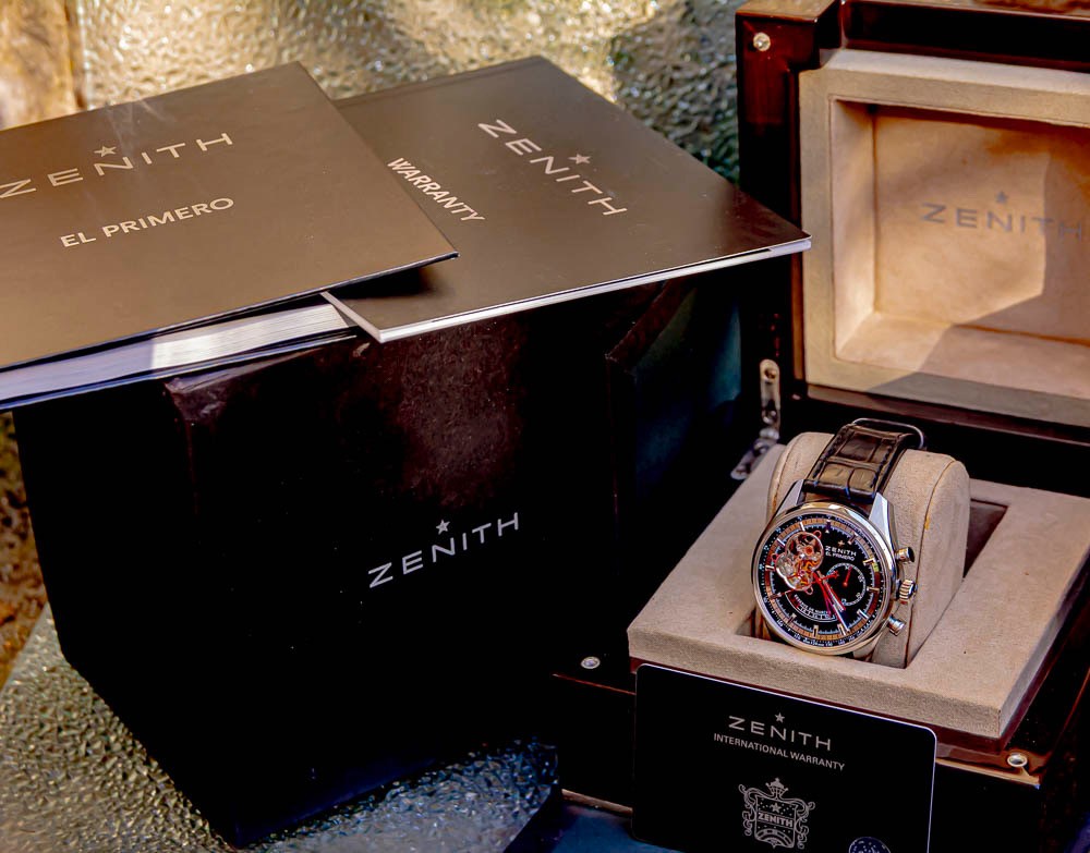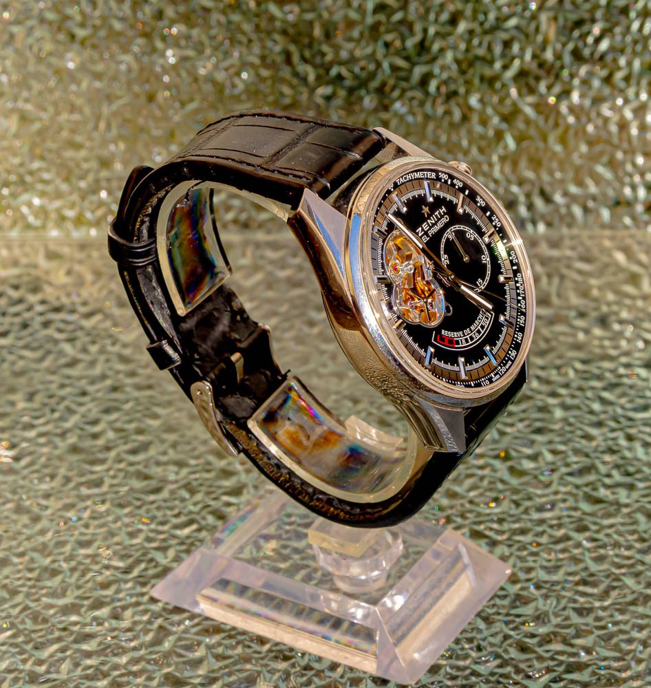 El Primero , comme son nom l’indique le premier, premier chronograph à remontage automatique crée en 1969 avec ici le célèbre calibre El Primero oscillant à 36 000bph. Superbe édition en livrée Noire balancier coeur ouvert et réserve de marche.